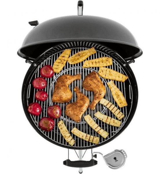 Размеры: 109 х 63 х 74 см. Варочная поверхность: диаметр жаровни 57 см. Вес: 19 кг. Особенности приготовления в гриле Master-Touch: Гриль Master-Touch предлагает большие возможности по приготовлению блюд благодаря большой жарочной решетки, площадь которой составляет 2400 кв. см., а также широким ассортиментом специальных аксессуаров, которые позволят увеличить возможности гриля. В гриле Master-Touch используется жарочная решетка из высококачественной стали с пищевым никелированным покрытием. Контролировать температуру приготовления блюд, Вам позволит точный термометр на верхней крышке, там же, расположены отверстия для циркуляции воздуха. Для точного контроля топлива, в гриле используются лотки-разделители. Точный контроль угля, а также чаша для отбора ненужной золы, упрощают приготовление продуктов. На гриле Master-Touch Вы сможете приготовить Ваши любимые блюда в кругу семьи, друзей и близких. Точный контроль процесса приготовления делают Master-Touch одним из лучших вариантов для частного использования. Особенности гриля Master-Touch: гриль Master-Touch черного цвета; легкое обслуживание гриля; много места для приготовления блюд; жарочная решетка выполнена из высококачественной стали с пищевым никелированным покрытием; термометр и вентиляционные отверстия сверху крышки, для точного контроля температуры; внешнее покрытие гриля - фарфоровая эмаль; закрытая чаша для сбора золы; чаша для угля мерная; термостойкие ручки гриля; колеса для перемещения гриля в нужное место. Почему стоит купить гриль Master-Touch? Американская компания Weber в гриле Master-Touch предлагает владельцу максимальные возможности по приготовлению блюд барбекю. С помощью гриля Master-Touch, можно выполнить любые поставленные задачи благодаря заменяемыми специальными аксессуарами, которые можно купить дополнительно в случаи необходимости в интернет-магазине grili.com.ua. В своё распоряжение, вы получаете гриль из высококачественных износостойких материалов, в котором продумана вся система приготовления блюд до мелочей. Для приготовления, в гриле Master-Touch, доступна большая жарочная хромированная решетка в комплекте. Удобный контроль потлива и чаша для золы, позволят без проблем контролировать жар в середине котла. Для транспортировки, на корпусе расположены термостойкие ручки, в любой ситуации ручки не нагреваются и позволяют переместить гриль. Для перемещение гриля в нужное место, также используются большие колеса устойчивые к разным атмосферным условиям.