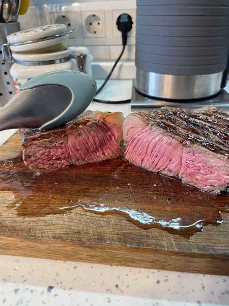 Добрый день. Сегодня испытал модель TP-27C на 4 щупа, правда использовал только один. Перед использованием опустил щуп в кипящий чайник, показал 99,1 градуса, но, сразу не понравилось время отклика, щуп в чайнике, чайник кипит, а температура 80, до 99,1 20-30 секунд задержка была, а может и больше. Готовил мираторговский стриплойн на электрическом гриле, стейк около получаса лежал при комнатной температуре после холодильника, термометр показал внутри стейка 13 градусов. Разогрел гриль на максимум, закинул стейк и на всякий случай засек время. Температура поднималась очень медленно, через 11 минут было 50 градусов, выставлял 57. Понимая, что по времени уже минуты три как пора, стейк снял. За 10 минут отдыха температура внутри поднялась до 65 градусов, стейк съедобный, но хотелось бы менее прожаренный. Прошу дать советы/рекомендации/комментарии как дальше работать с этим термометром, нормально это или нет, что я сделал не так? Результат на фото.