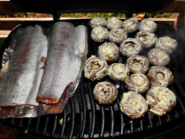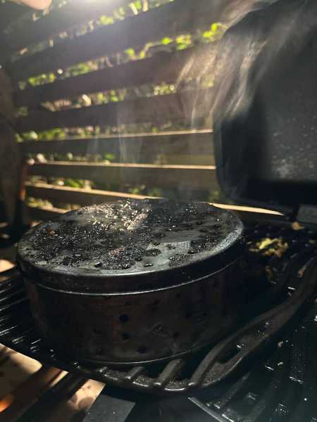 Ребята, вчера так сильно заходелось подкоптить форель, но нормального контейнера для щепы не было, и рядом нигде не продаётся. Полез в дедовский гараж в поисках артефактов, и откопал металлическую коробку из-под печений, которые дарили обычно друг другу на Новый Год. Коробка была 2011 года. Вот, спасибо, что её когда-то не выбросили xDD. Её изначальный красивый праздничный вид я не запечатлил. Я взял молоток и гвозди. Семья голодная, все хотят рыбки, а я уже ничего не слышу, в голове только "Ща по-быстрому дырки сделаю, и можно будет жарить!" Делал дырки я... не быстро 🙂 Уже устала кисть, но радость от поделки не давала мне это чувствовать. Припахал старшего, чтобы держал мне бвревно, когда я дырявил боковинки. Голод почти не чувствовался. И наконец, работа была закончена. Осталось только обжечь коробку, но было негде. Налил бензина в бочку для сжигания веток, за секунде поджёг, и кинул коробку туда. Через 10 минут я её оттуда достал, полностью готовую к использованию. Коробка оказалась слишком толстой, чтобы полностью поместиться под решётку, поэтому решётка была приподнта на пару см., и сдвинула к центру, чтобы крышка могла закрыться. Ну что я могу сказать, это того стоило! Рыба, конечно, подкоптилась, но это особо не чувствовалось по сравнению с грибами. Боже, это были самые вкусные грибы, копчёные на вишне... Вкус был просто потрясающий! Прилагаю фото рыбы и грибов на гриле, и фото контейнера после использования. Всем вкусной еды, крепкого здоровья, и хорошего настроения! ❤️