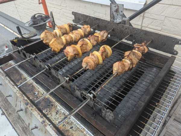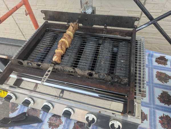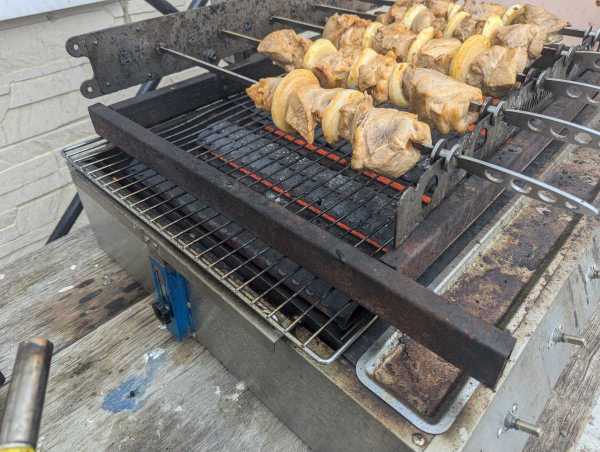 У меня керамические горелки 6штук, с железными пластинами на них. И вот такую приставку взял со своего старого угольного мангала, с автоперворотом. Обошлась это приставка лет 12 назад вместе с шампурами тысяч 20 наверно. Размер приставки 60см ширина на 12 шампуров с полезной длинной шампура 40см. Вот под эту приставку искал себе гриль. Рад до безумия что перешёл на газ с угля. С углями вечная проблема, то потухнет, то горит неравномерно, а когда жарю шашлык каждый день, то естественно про нормальный уголь речи не идёт, это обычно были обрезки сосновых досок, на моей вечной стройке. Утром, вечером, в обед всегда если захотел сразу жарю шашлык. Разницы абсолютно никакой, запах тот же самый, стоит для всех соседей. Иногда запах усиливаю с помощью щепы в фольгированных конвертах, которые раскладываю под горелками на поддон куда жир лишний падает, если зажечь сначала на полную мощность, то через минут 5-10 конверты начинают дымить, уменьшаю пламя по руке секунд 8 чтобы удержать можно было и начинаю нанизывать и расставлять постепенно, через 25 минут усиливаю пламя, куски на шампурах у меня большие и сначала мне нужен был прогрев мяса, усилив до 5 секунд, ещё через пять наношу кетчуп на мясо, через минуты 3 снимаю. В среднем 35 минут с корочкой и сочный внутри, по щупу внутри куска 67-70 градусов. Если где-то на куске жир с самого начала темнеет быстрее всего, то наношу на него кетчуп кисточкой силиконовой. Шашлык с шампуров всегда срезаю острым ножом, разделяя как бы кусок на пополам, здесь же и отсортирую куски по спискам по предпочтениям семьи или гостей. Я люблю например температуру куска 65 градусов или близкую к ней, кому-то более жирные, кому-то более мягкие. Кетчуп выполняет двойную роль, маскирует не приятный для кого-то розовый цвет внутри куска. Жарю шашлык из лопатки теперь, из шеи надоело. Горелки керамические трудятся пока ежедневно один два раза в день уже месяц. Посмотрю, что дальше будет с этим китайским грилем. По моему мнению шашлык на 90 процентов это правильный жар, с углями как я сказал я мог промахнуться, а газ точен как часы в данном вопросе. Я не имею на мангале своем крышку, мне просто нужна была жарочная панель. Маринад для повседневного использования считаю наиболее удачным это на 4,5кг пол пачки майонеза большой, пол пачки кетчупа, пол пачки бульона Ролтон, вода 300мл, и уксус 9 процентов 200мл. Через 4 часа в теплой комнате, у мяса как-то начинает появляться первые признаки маринования и уже будет вкусненько. Дальше не использованное мясо лежит в маринаде в холодильнике и последующие двое суток оно будет вкусным и сочным, больше по времени мясо не лежало в маринаде у меня килограмм 5 съедали за 2 суток точно. Если лук не забыл купить то нарежу кольца и аккуратно добавлю в маринад, лук здесь не ингридиент, а продукт который я также хочу пожарить вместе с мясом. Сам по себе я больше люблю молочно кислые маринады без уксуса, с луком без соли, соль за час до приготовления, но данный тип маринада для ежедневного использования утомителен и дорог, так как требует много лука испортить в качестве ингридиента для маринада. И не может стоять больше суток не испортив вкус мяса.