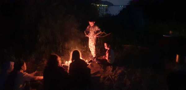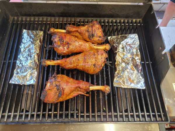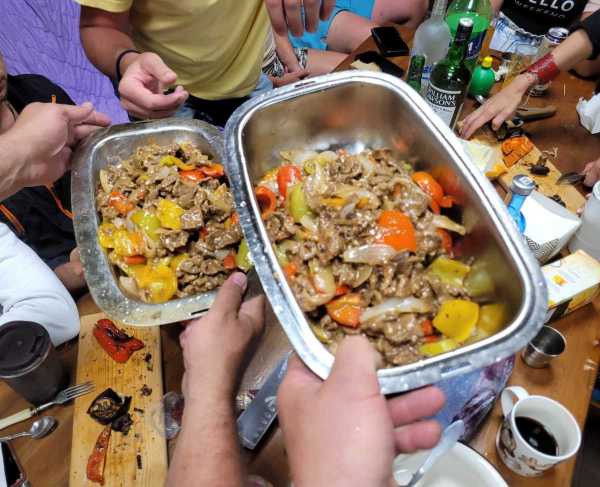 Вторая стоянка с ночевкой была у меня на даче. После длинного, с раннего утра, и непростого перехода, пришли ко мне под вечер. По быстрому для перекуса сразу приготовил голени индейки и овощи на гриле, под белый соус из греческого йогурта и майонеза с чесноком и зеленью. Надо было быстро накормить толпу 21 чел, из которых 13 взрослых и 8 детей. И параллельно один из учстников готовил мякоть говядины, наподобие гуляша, не знаю, как называется, но мне прям очень понравилось, мясо очень нежное и сочное, я не понял сперва, что это говядина)