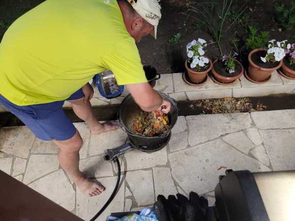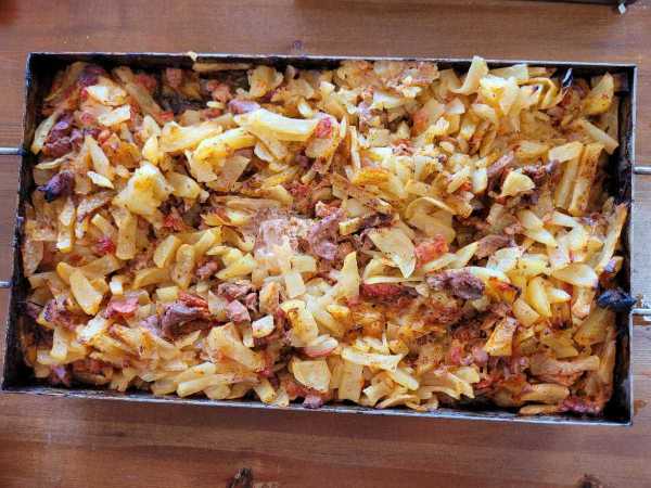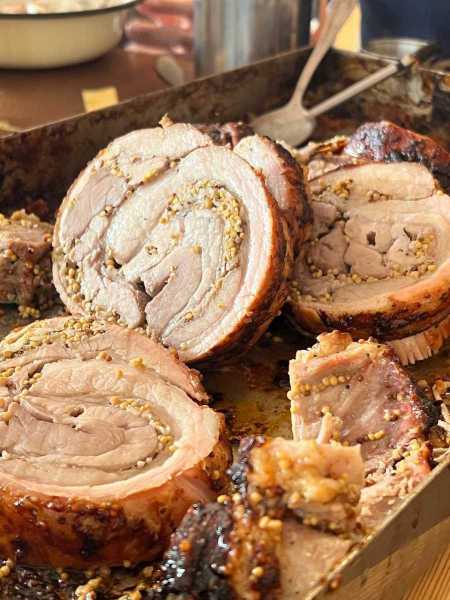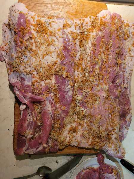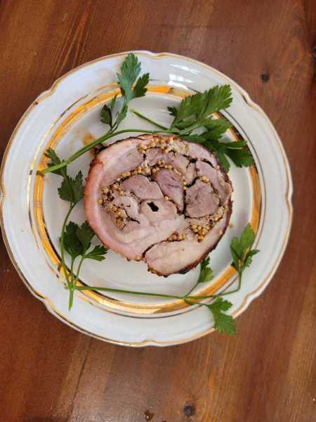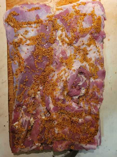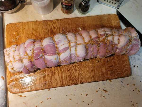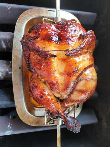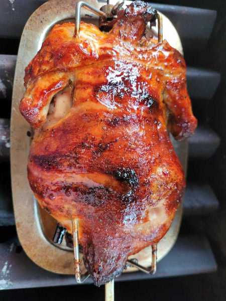На следующий (третий день) приготовил на своем гриле картошку с мясом в луково-помидорном кислом маринаде, и рулет из свиной грудинки над ним. Рулет делал второй раз в жизни, и с учетом первого опыта, на этот раз рулет получился отличный, и гости оценили. Фото подготовки рулета, разделывал еще дома до похода, и предварительно отвез на дачу. ---- 20250614_122124.mp4 А, так же обычную курочку на вертеле.