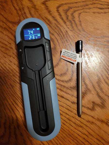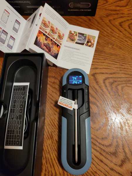 3. Опробовал термометр на мясе в гриле. База держит связь с датчиком (который в мясе в гриле под закрытой крышшкой) примерно до 10м, до 8м устойчиво. Так же примерно держит и тлф с базой, метров 10-12. В пределах веранды и небольшого моего двора норм. Это в основном через стены построек. Температуру показывает, сигнализация на заданную температуру срабатывает. Так же удобно, есть таймер в приложении, тоже пользовался. Мясо в гриль заложил хоолодное, читал, что желательно комнатной температуры, но так вышло) Термометр наглядно показал, что луьше наверно все же мясо закладывать в гриль растепленное. Температура внутри мяса поднималась до 30° долго, минут 20 наверно, возможно это нормально, но показалось, что пока внутри холодное, прогревается долго, снаружи может подгорать за это время.