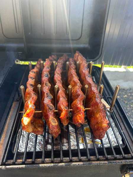 Решился и я самостоятельно попробовать пеллетник, с очень сильным до невероятности предвзятым отношением к ним... В общем появился у меня Traeger Ranger. Офсетника нет уже, да и смысла сравнивать с ним нет (у него не может быть конкурентов по вкусу). Затеял сравнение вариантов Oklahoma Joes Rambler брикеты+ чанка (Есть с огня) и Traeger Ranger пеллеты (Есть с огня). Готовил Baby Back ribs 2-1-1. Rambler 120 градусов всю дорогу, Ranger 80 - 2 часа, потом 105 до конца. Сравнительные половины лент SPG без мопа. Итог, c траегера ребра оказались более сбалансированные (даже где-то отдаленно похоже на легкую версию офсетника), менее копченные, зато вкус мяса и раба раскрывается лучше. В общем я ожидал худшего, но оказалось весьма не плохо. Продолжу наблюдать и читать за пеллеты теперь, а там глядишь и не буду продавать его, но это не точно) Спустя 2 часа (справа Ranger) Спустя 4 часа (справа Ranger) Верх Ranger, низ Rambler.