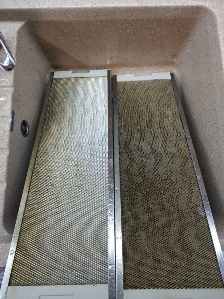 Смотрите во что превратилась сетка от моей вытяжки после пары месяцев активной эксплуатации weber q 1200 под ней на кухне: Справа решетка до очистки, слева решетка очищеная универсальным очистителем из этого поста Что примечательно вытяжка хоть и расположена над плитой и грилем соответственно, на ней скопилось изрядное количество жира