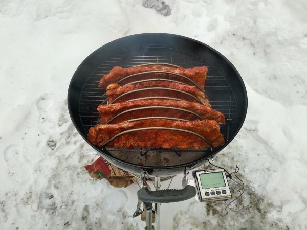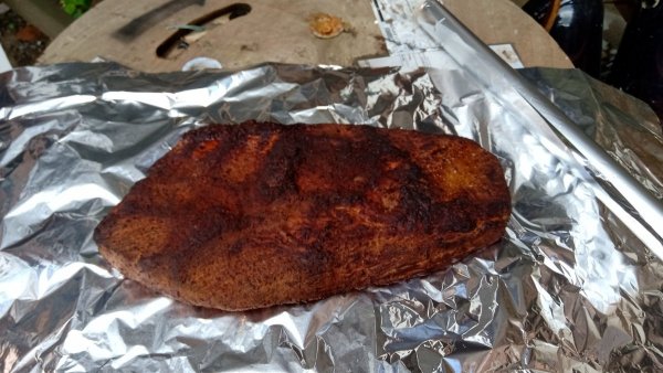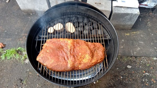 Всем привет. Вот нехорошие вы люди, ой не хорошие. Смотрел фотки. Читал, облизывался, завидовал, страдал. По итогу психанул и разорился на неделе, купил замороженную грудинку 6 кг весом. Размораживал в среднем холоде три дня. В упаковке оказалось два куска в среднем толщиной около 40мм. Вес в районе 2,5 кг после «обрезания». Сегодня запек первый. По специям: соль, перец, паприка, зира, каенский перец. Чанки из оливы. Гриль Weber Classic Kettle с корзиной SnS, вода в емкость и поддон для сбора жира. Температура приготовления 110С первые пару часа пока чанки дымили, потом 115-120C. Довел до 63С в теле продукта, запаковал в фольгу и грел до 93C внутрях. Воду в процессе не доливал. По итогу на приготовление ушло 11 часов 12 минут. На вкус – пушка. Сочный, ломается вилкой, пока ломаешь сок льется как со спелого фрукта. Придется теперь семейному бюджету страдать периодически)