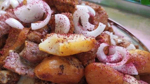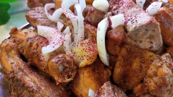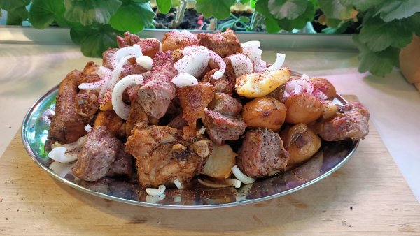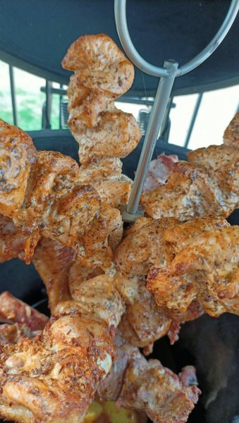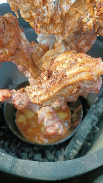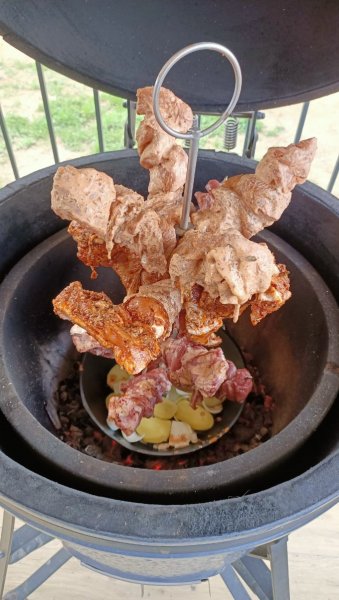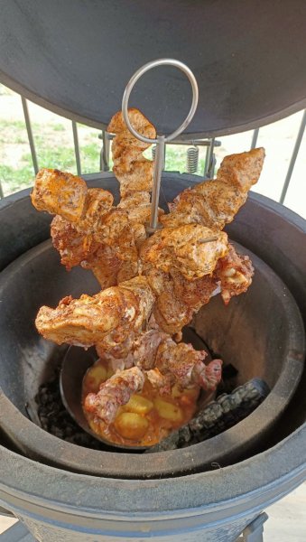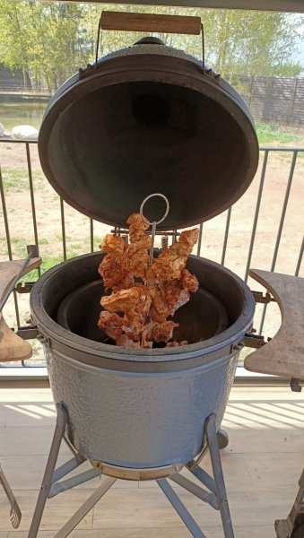 Сегодня попробовал приготовить на "ёлочке" для тандыра. Три небольших березовах полена, сухих. Дождался с закрытой крышкой пока прогорят до углей. Кочергой в руковице угли по углам рассортировал. Поставил ёлочку на 30 минут и закрыл все отверстия в яйце оставив маленькие щёлочки что бы пар уходил. Мужчины, это песня!!!! Мясо сочное, нежное, как драгоценный янтарь... Я замариновал свинину (грудинку маложирную), курицу (ассорти), грудку индейки в молоке с паприкой. На дно чугунной чаши, под ёлочкой, положил кортофель и лук, сок с мяса стекал в чашу и потом я им полил мясо на противне перед подачей гостям 😊😘 Особенности приготовления пищи в яйце заключаются в том что мясо запекается в собственном пару без эффекта конвекции. Поэтому нет подгорелых кусочков, суховатости снаружи.