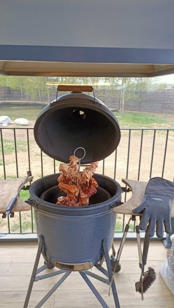 Друзья, уже несколько лет владею керамическим грилем BergHOFF. Качество отличное, а учитывая цену в 150000 против 300000 и выше за Большого Зелёного друга и ему подобных, покупка крайне выгодная ) Гриль по началу терпел все мои неумелые эксперименты, я приспосабливался к его неспешному темпераменту и особенностям, потому что до этого тупо жарил мясо на шампурах в мангале и не понимал зачем эти яйца, эти грили и прочие дорогие игрушки ) Сейчас могу смело заявить, что я понял все его сильные стороны и особенности. Перешёл с угля на берёзовые дрова, два-три поленца и готовить можно долго и вкусно. Уголь такого КПД не давал, а тупо прогорал. Ну может уголь Вебер держался дольше всех, но сухие дрова перекрыли все мои потребности в томлении, тушении и жарке! Увидев как наши русские ребята в Америке в своё яйцо ставят ёлочки и шампуры для тандыра, купил ёлочку ) Пока не пробовал, но сомнерийй нет, что приготовит не хуже чем в тандыре. Ведь особенность керамических яиц в том что там невозможно пересушить мясо, оно даже с горелой корочкой снаружи всегда будет сочным в нутри ) Сделал для яйца мощную вытяжку с внутренней подсветкой, теперь готовим и едим на закрытой веранде даже зимой ) Согреться помогает ИК обогреватель на 2,5 кВт для открытых веранд )
