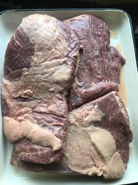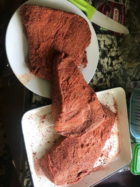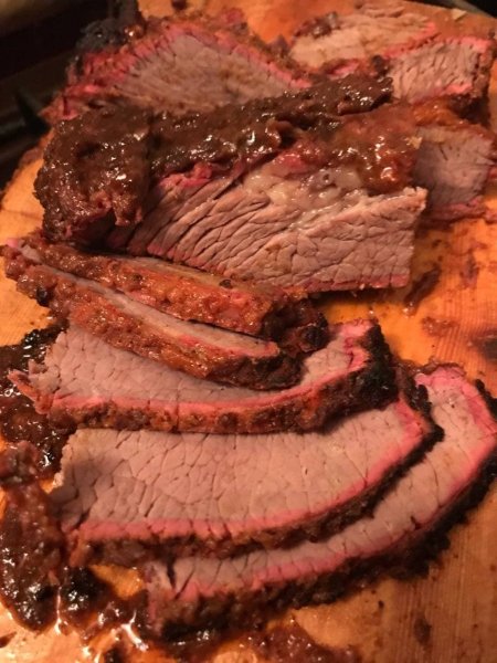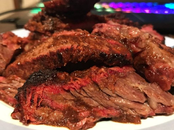 Отчёт: мой первый брискет. Смокер: TERRINGTON HOUSE Мясо: Мираторг грудинка блек ангус без кости Топливо: уголь березовый, сверху джерки яблони (собственные) Раб: паприка, копченая паприка, чили, соль, черный перец, чеснок Моп: Уксус яблочный, яблочный сок, вода Брискет план: 1) 4 часа жирной стороной наверх. Температура 110-120 градусов. опрыскивание моп соусом. Джерки для копчения подкидывал обильно. *1 пункт заканчивается, когда внутренняя температура мяса будет 65-71 градус (в реальности эта фаза заняла не 4, а 5 часов!) 2) 4 часа жирной стороной вниз. Мясо закутываем в фольгу 2-3 слоя. Продолжаем нагрев 110-120 градусов без копчения. До внутренней температуры 93-95 градусов (в реальности эта фаза заняла не 4, а 5 часов!) 3) Отдых до 65 градусов в фольге (2 часа) Итог: Минусы: на фазе 2 в фольге видимо произошел слишком быстрый набор температуры (с 65 до 95 градусов за 5 часов), по этому когда я открыл фольгу, там была лужа из ценного вкусного сока. Само мясо оказалось суховато (видно на фото). Кто знает почему так, и верна ли моя догадка - пишите. Плюсы: супер вкусно, супер сочно, нежно, мягко, гастрономично. Копчение по краю глубокое. Вкус копчения соленый, острый и деликатесный. Всё по кайфу) Тест на нож пройден. На желеобразность и мягкость тоже.