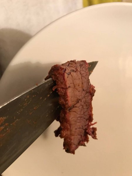 Конечно это вкуснятина безумная. Мясо нежное, тест на гибкость прошло, вкус нереальный. Но я просто увидел весь этот сок на дне фольги (последняя стадия проходила в фольге) и он прям вытек: желтый, вкусный, раритетный. Я в него обмакивал кусочек брискета и становилось еще вкуснее. Вот и подумал, что я где то переборщил может со скоростью набора температуры, что он выпер наружу под конец.