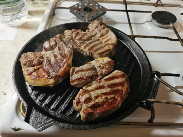 Спасибо, обязательно попробую каре на гриле. Сегодня же, по дороге с работы, не удержался, купил стейки из баранины и пожарил на купленной утром сковородке чугунной. Все удовольствие 440р 🙂 Получилось вполне себе вкусно. Прожарку делал медиум, мясо получилось нежное и сочное. Вкус менее насыщенный чем у рибая конечно, но понравилось! Буду готовить. Дыма было кстати гораздо меньше чем с рибая. Возможно помогла специальная сковорода-гриль, либо я по совету из ютуба не лил масла, а стейки смазал оливковым маслом за час до готовки и перед жаркой хорошо обсушил бумажным полотенцем. 3 минутки с каждой стороны и отдохнуть минут 5 под бумагой. Прожарку не сфоткал.. 🙂