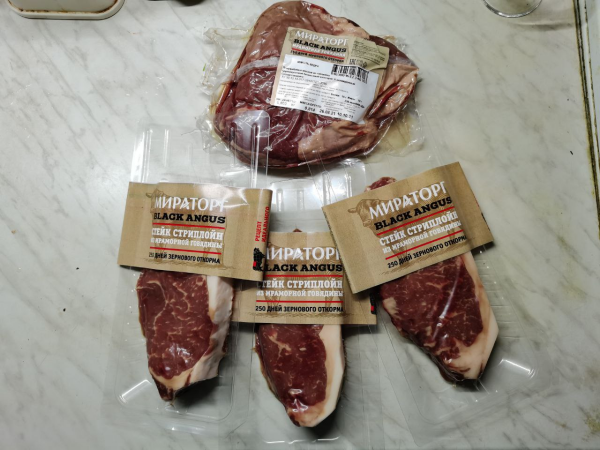 Опять прилетела скидка 25%. Посмотрел стейки - в наличии ничего не было в приложении магазина.. но рискнул пойти ногами и на витрине висели 3 штучки мраморного Стриплойна от Мираторга. 🙂 А я его как раз еще не пробовал готовить.. Обошлись по 552р, весьма недурно. До кучи взял еще мякоть бедра, попробую приготовить "а ля Ростбиф" или может замариную типа Пастрами. В крайнем случае плов из него приготовлю.. 🙂