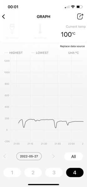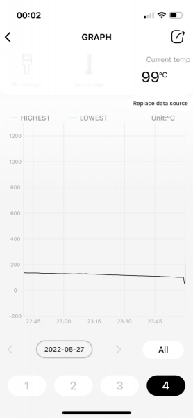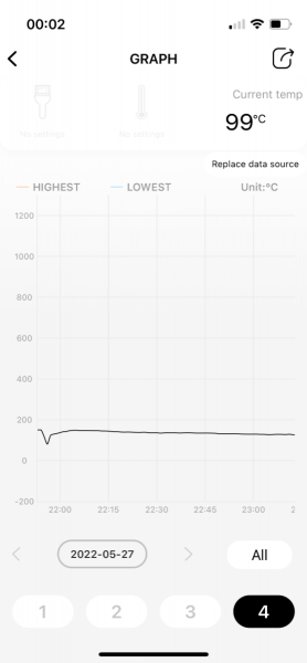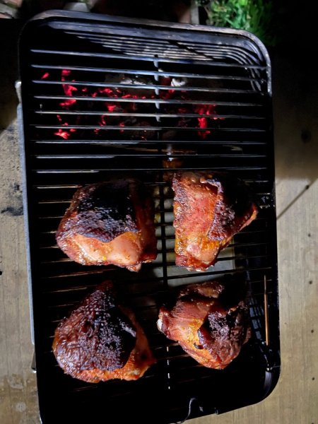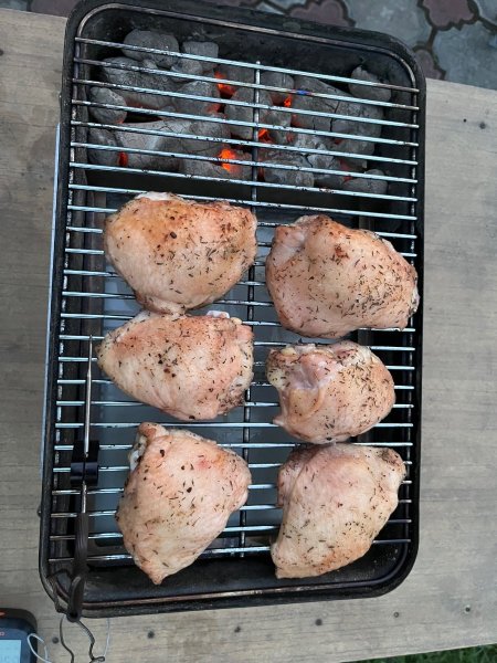 5. В мае так копчением на Гоше и не занялся. Корзину использовал для запекания, разогревал в старте 5-6 кусков брикетс, немного мелких остатков после предыдущего использования. Снизу вентиляцию открывал наискосок, чтобы была полностью открыта со стороны угля. Сверху соответственно со стороны продукта. Температура долго держалась в районе 180-170 градусов. На графике участки падения, когда менял продукты или подкидывал щепу. фото с одной закладки курицы в светлое время, и фото и график с другой.