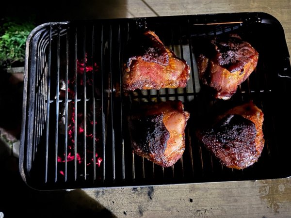 4. Вчера сделал 2 килограммовых куска карбонада из мираторга, разрезал их пополам. 5 кусков брикетов главжар, для лучшего розжига в стартере добавил мелких углей. щуп некуда было поставить, а термометр в крышке упирался в мясо, так что ориентировался чисто по внутренней температуре. Сначала росла быстро, потом почти перестала, когда ближний к углю кусок дошел до 70гр. Довел до 72 (примерно 1:20 от начала приготовления), снял его, остальные куски чуть ближе к углю сдвинул, брикеты поворошил вилкой, чтобы золу снять, хватило дойти остальным до 71гр.