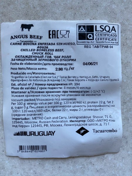 Дополню отзывом. Заказывал с доставкой, так как была скидка 10%, плюс в самом магазине сейчас скидка 20% на охлажденную говядину (не всю, но есть из чего выбрать). Производитель Tacuarembo. Чак ролл 5 кг привезли как два отдельных отруба 3 кг и 2 кг, само мясо зачищено хорошо, но порезано с каким-то скосом, в общем довольно неровные куски получаются - это не очень понравилось. Изначально хотел часть отруба оставить на стейки. Ладно, спишем на минусы покупки с доставкой.