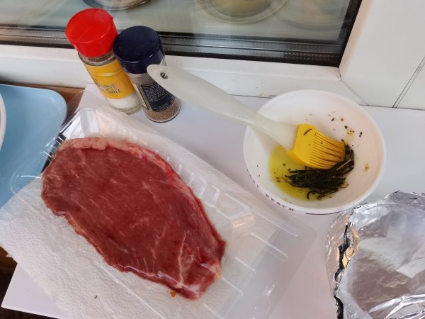 Итак, Пиканью я пожарил. Ну, что сказать... Говядина. Нормальная. Разогрел снова гриль до ощутимого дымка на Максимуме. Смазал оливковым маслом с чесноком и травами ДО и После (в смысле, при переворачивании). Стейк был тоненький, так что жарил по полторы минутки с каждой стороны. Ну что... Нормально... (Разводит руками) Но Вырезка с рынка, НЕ выдержанная и НЕ ферментированная ЛУЧШЕ! За 1К, рублей/кг.... 😎 Впрочем, у мну закуплен и продолжает созревать ещё и один Рибай... Со временем, Заеними! А пока, обещанные фото...