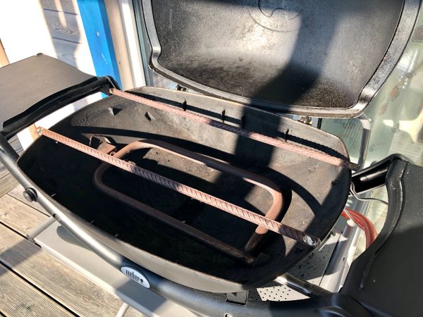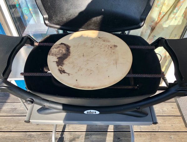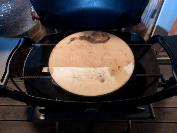 Никак не закажу приблуду для камня... В результате устал ждать, когда гриль разогреется (минимум час двадцать!) и сегодня взял две десятимиллиметровые арматурины, отпилил под размер, сделал аккуратненько углубления по краям (чтобы не двигались в процессе эксплуатации)... уложил камень и запустил. Результат: ~30 минут от запуска до готовности пиццы! Температура окружающей среды -1 градус... летом будет быстрее. Выглялит этот дерибас вот так (завтра сделаю фото получше)... 🙂