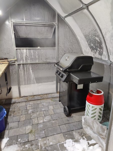 с учетом того что мясо я готовлю круглый год, года 3 назад я поставил небольшую тепличку у крыльца, чтобы жарить в ней в дождь/ветер/снег. Там минус, такой же как на улице, но за счет небольшого объема, после начала работы гриля, угольного, а теперь и газового, внутри достаточно быстро становится тепло.
