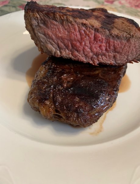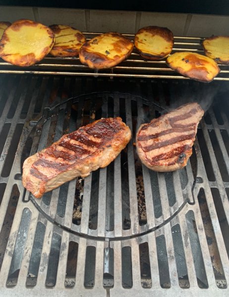 5. Немного о непрямом жаре. Стейк в 5 см толщиной (обратный метод) достаточно оперативно дошел до кондиции над потушенной горелкой, после чего был обжарен над горящей. Все ОК.