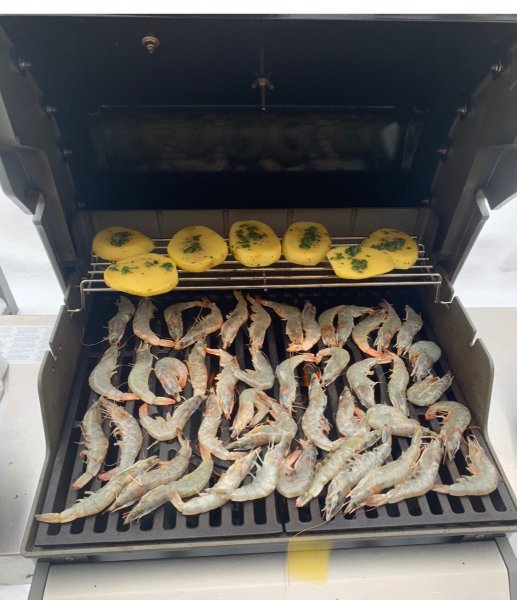 2. Небольшие особенности готовки. При работе со стейками (в отличии от камадо) каждое поднятие крышки сильно охлаждает гриль. Банально, но в случае газового гриль больше нужно использовать таймер, чем визуальный контроль. По чугунину. Делал пару блюд. Оба по рецепту Сергея из Г-Б-клуба. Все в жаровне диаметром 28 см и высотой 8 см ("Камская посуда", кажется). Сосиски с фасолью делались в минус 8, жаровня ставилась на решетку сверху. Все получилось. Но показалось, что будь еще на пару градусов холоднее, то все могло бы растянуться по времени. При этом газ не мерз, он у меня вообще пока не мерз еще. Но "длинные" блюда на данном гриле не предполагаются, так что надеюсь избежать эксцессов с обмерзанием баллона. Второе блюдо в жаровне - стир-фрай из креветок и овощей. Здесь я решил поставить чугунок в GBS. Пришлось демонтировать среднюю ароматическую пластину. Сам чугунок (напомню, 28 см) висит на ручках. То есть небольшой люфт имеется, но провалиться он не может. Приемлемо, но, наверное, лучше что-то под размер. Думать буду (разницу от стоимости с Напом как раз можно на голландскую печь спустить 🙂, или на дешевый вок из нержавейки + пиво).