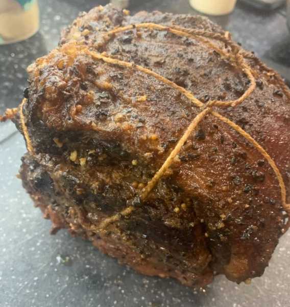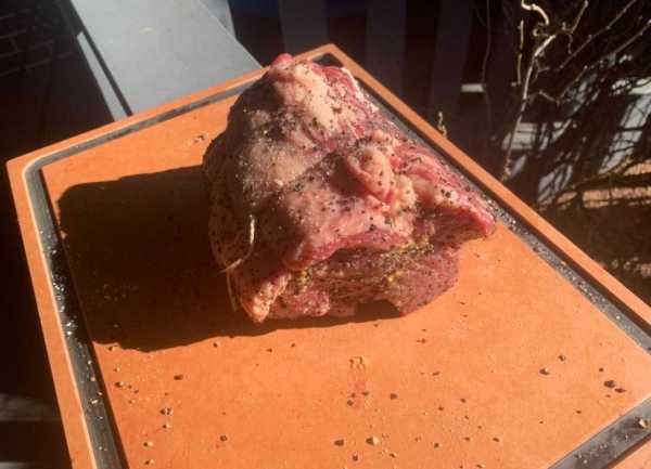 Кусок (1,8 кг примерно) ноги говядины. Мраморная от Праймбиф. Рулет с дижонской горчицей, специями (соль и дробленый перец из расчета 1 чайная ложка без горки каждого ингредиента на 1 кг мяса) и тертым «пармезаном». А дальше по методике брискета - до 65-67 градусов внутри. Потом обертывание в фольгу и 95. В камадо весь процесс температура была 115 градусов. P. S. Вышло слегка суховато. Нужно было пожирнее кусок взять. Или вообще отруб типа чак ролл. Или бекон внутрь положить 🙂