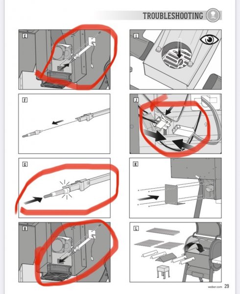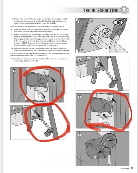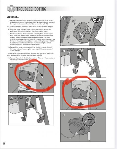Нашел мануалы на weber ex4, без vpn у меня не открывается, посмотрев мануалы увидел следующие различия: 1. Как и писал вставка в бункер, это лист во всю длину который прикручен двумя винтами, это увеличено уклон который теперь составляет 33 градуса и это исключает зависание пилет, под собственным весом уходят в шнек. 2. Изменили форму держателя свечи, также изменили подключения питания к держателю, раньше был конвектор с двумя пинами, а теперь сделали для каждого провода свой клеммник 3 изменили крепления мотора, раньше он прикручивался двумя винтами по диагонали, теперь он крепится тремя винтами. 4. изменили сам шнек, раньше он был сварен точками(стержень и лопасти), теперь его проварили на всю длину. 5. также в верхней части бункера добавили решетку, назначение которой мне непонятно. В какой последовательности пилились эти изменения вычленять не буду, вот вам все мануалы https://www.weber.com/US/en/help/schematics/browse/22510001 а вот фотографии различий