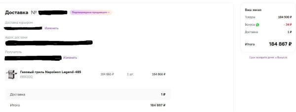 5. Изначально было 40%, но при оплате картой возникал затык со сбером и оплата не проходила. При этом СММ создавал заказ, который отменялся из-за неоплаты, но при этом оставался в истории заказов (теперь там 3 отмененных заказа и 4й оплаченный). И на третьем заказе вместо скидки 40 стала появляться и исчезать скидка в 41%, на четвертом заказе я её уже осознанно ловил и при её появлении положил гриль в корзину и оплатил пэймиром (пришлось завести). И наконец всё получилось. 75 796 сберорублей.