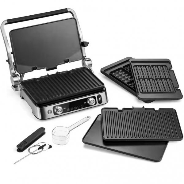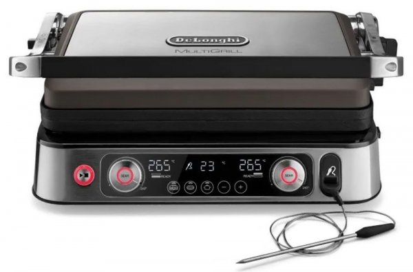 Давно подумывал купить для дома электрогриль. Никакие модные громоздкие модели не рассматривал, хотелось компактный в меру мощный и с хорошим антипригарным покрытием. Пересмотрел возможности многих моделей и сразу понял что только две модели подходят по моим запросам либо Bork G802 либо Delonghi MultiGrill CGH 1130 DP. Учитывая что Bork у нас не представлен, то с выбором проблем не было. Что сказать, если честно даже и не ожидал что электрогриль может быть таким приятным в приготовлении пищи. Качество приготовленной пищи меня приятно удивило. Готовил на нем свиной стейк на кости, тонкие пластины куриного филе, речную форель, овощи и цыплят. Всё получается очень вкусно. Температуры для жарки хватает за глаза, максимальная постоянная температура жарочных поверхностей 240 градусов, есть режим кратковременного запечатывания мяса на температуре 265 градусов. У гриля присутствует раздельная регулировка температуры верхней и нижней рабочей поверхности. Нагревательные элементы установлены прямо в жарочные поверхности, легко снимаются и позволяют их мыть в посудомойке. В комплекте идет термощуп, температуру показывает на дисплее, можно выставить температурный порог, и когда он будет достигнут, гриль подаст звуковой сигнал. У меня комплектация с 3-мя разными парами жарочных поверхностей. 2-е рифленые, 2-е полностью гладкие и 2 для венских вафель. Гриль имеет ОЧЕНЬ красивый вид, впишется в любую кухню. Одним словом могу смело рекомендовать тем, кто выбирает компактный электрогриль с ОЧЕНЬ хорошими техническими возможностями. Пересмотрев много грилей и скажу вам что наверно это самый технологичный гриль из всех существующих сейчас на рынке. У кого есть какие вопросы, спрашивайте, всем отвечу.