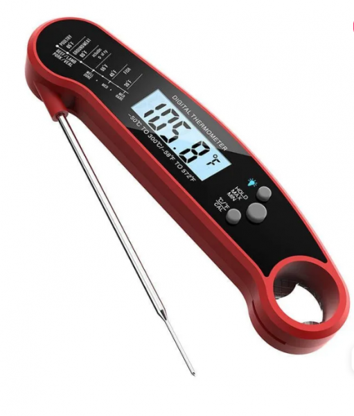 По совету более опытного, взял на Озоне термометр "Термометр кулинарный для барбекю, кухни, гриля, с щупом 11 см" за 770 рублей. Измеряет точно и быстро. Погружная часть щупа термометра тонкая (не дырявит). Подсветка. Встроенная открывашка. Магнитный, т.е. можно прикрепить на корпус гриля. Автоматически выключается при раскладывании щупа. Запись минимальных и макс значений (не пользовался). В комплекте инструкция по температурам для степени прожарки. Доволен устройством.