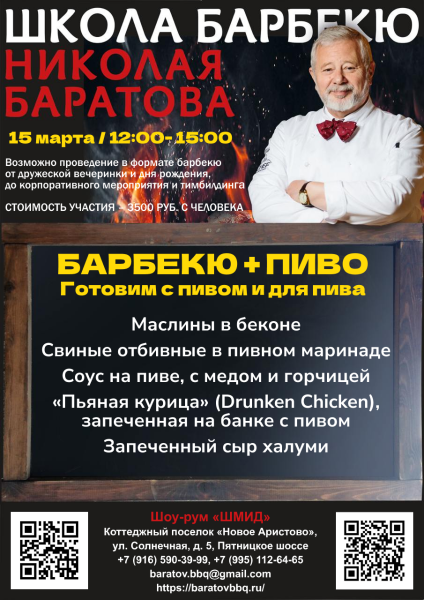 ШКОЛА БАРБЕКЮ НИКОЛАЯ БАРАТОВА ПРИГЛАШАЕТ 🔴 https://baratovbbq.ru/ Занятия ведет Николай Андреевич Баратов – международный кулинарный судья участвовал в чемпионатах в десятках стран. Автор 13 кулинарных книг, из них 5 о барбекю и гриле, участник более 150 кулинарных телепередач. Под руководством мастера вы овладеете секретами приготовления на барбекю блюд из мяса, птицы, рыбы и морепродуктов, фруктов, овощей, и даже супов, выпечки и десертов 🔴 @BARATOVBBQ - для всех, кто хочет открыть в себе скрытые таланты грильера Темы ближайших занятий: 🟡 Базовый курс барбекю 🟡 Настоящие BBQ-бургеры 🟡 Beer&BBQ - готовим с пивом и к пиву 🟡 Барбекю по-итальянски 🟡 Блюда в стиле «Текс-Мекс» 🟡 Готовим весь обед на барбекю 🟡 Барбекю в азиатском стиле и др. Каждое занятие завершается обедом из приготовленных блюд. Занятия проходят по выходным с 12 до 15 часов в Шоу-рум ШМИД на Пятницком шоссе, коттеджный поселок «Новое Аристово», ул. Солнечная, д. 5 Стоимость участия 3500₽ с человека 🔴 @bbqlife2022 Николай Андреевич Баратов 🔴 http://wa.me/79165903999 🔴 +7 (995) 112-64-65 🔴 vk.com/club226135976