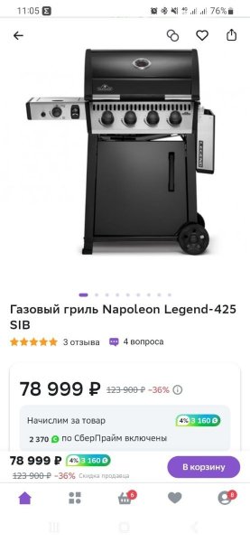 Думал, читал и всё-таки заказал себе гриль. Учитывая бонусы на мегамаркете, решил пожертвовать высотой крышки фристайла и взять легенду в самой простой комплектации за 90К. Оплачивал тиньком, поскольку он давай повышенный кэшбэк 2К на первую покупку на ММ + бонусы мегамаркета 36.8К. Если всё пройдёт гладко, то на бонусы сбера смогу купить 18л. композитный баллон и родной наполеоновский вертел. Короче жду...