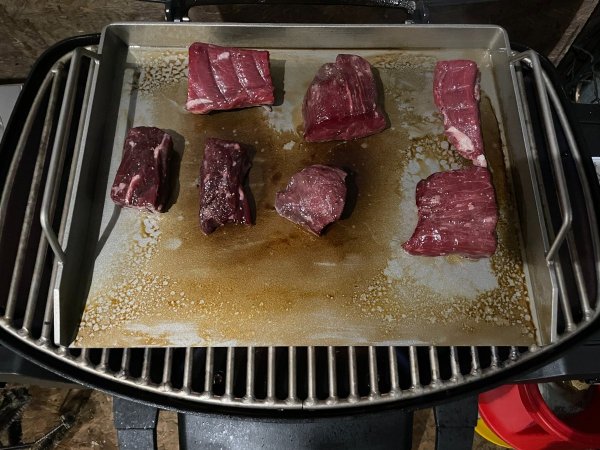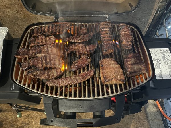 На выходных было несколько экспериментов. Попробовал пожарить стейки из вагю и овощи на напе 285. Из-за того, что мясо слишком жирное, на гриле все время приготовления было фаершоу, на мясе появилась подгорелая корочка. Вероятно нужно такое готовить на планче.