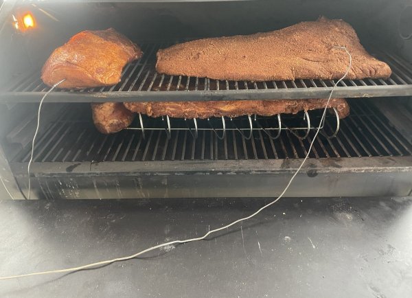 На прошлых выходных готовил в пеллетнике брискет, свиную шею и свиные ребра. Ребра оказались мелковаты для оригинальной подставки gmg, поэтому пришлось разместить их на ней сверху.