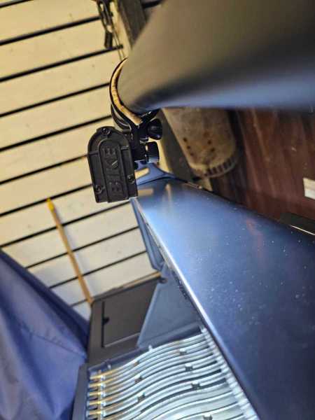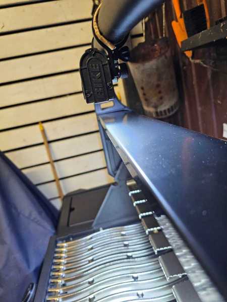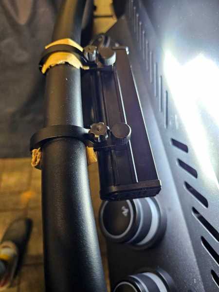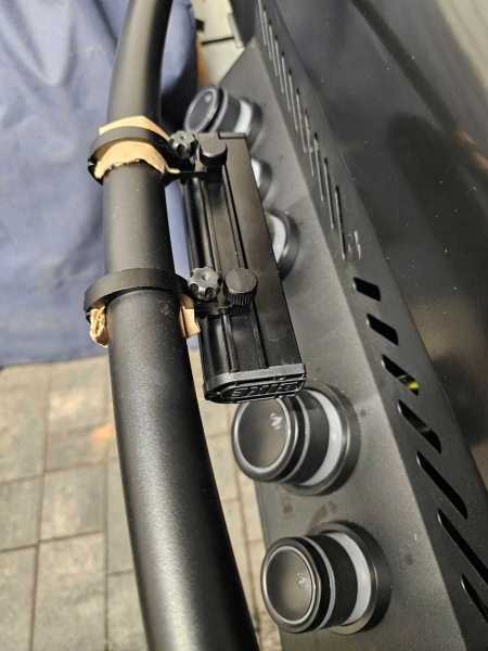 @XpIOHgeJIb на выходных не успел, сделал сейчас. Крепление. Думаю видно что фонарь жестко фиксируется только в напавлении перпендикулярном ручке. На картонки не обращайте внимание. Диаметр ручки гриля не соответствует диаметру руля велосипеда. Надо или подматывать изоленту. Или подбирать резинки. Вид сбоку при открытой крышке. Видно что при прямой или чуть более высоко расположенной ручке фонарь светил бы четко в край крышки. Освещение в трех режимах. Ближний, дальний и смешанный. На фото разницы нет, но глазом немного видно. По факту любой из них обеспечивает света более чем достаточно.