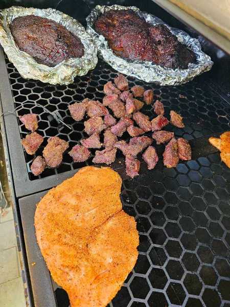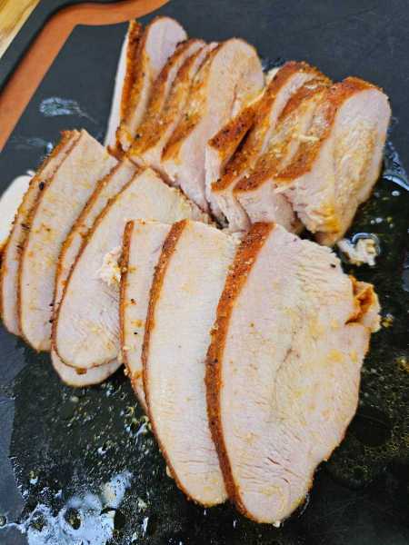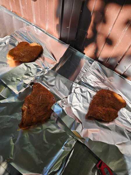 Грудка индейки. Берем средние грудки (по 1кг где-то) Засыпаем рабом. (у меня Аstrorab). Комптим на 100-120 до 57 втутри. Заворачиваем в фольгу со сливочным маслом. Доводим до 68.