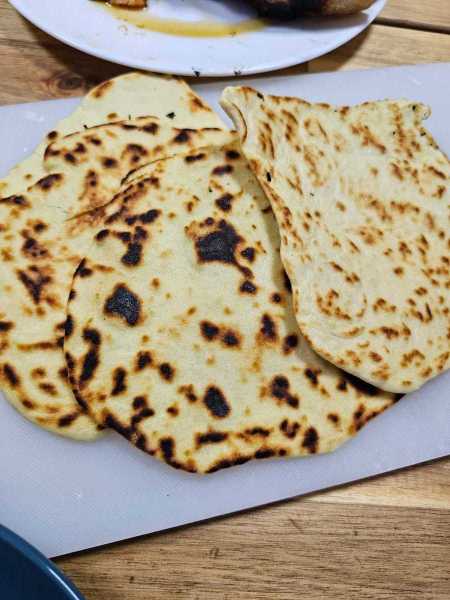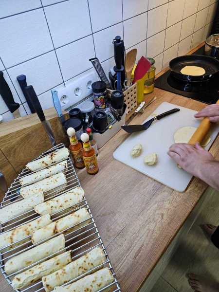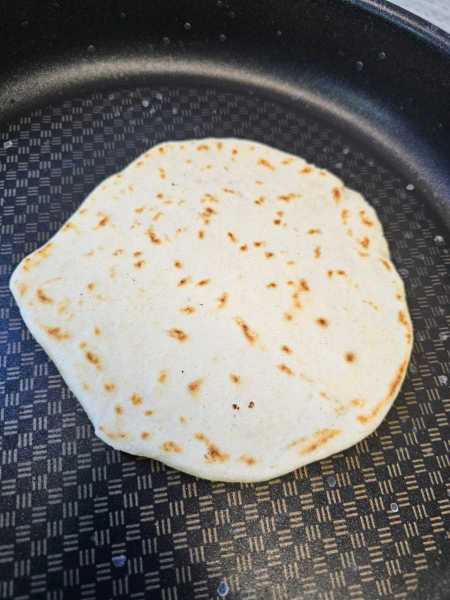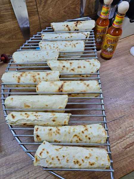 450гр муки (300гр пшеничной +150кукурузной, можно просто пшеничной) 12гр разрыхлителя 15гр мелкой соли (иначе будут кристалы при раскатке) 130гр топленого говяжьего жира (у меня брискетный) 250гр теплой воды Сначала смешиваем сухие ингридиенты Потом вводим слегка потогретый жир. Перемешиваем. Добавляем воду. Окончательно замешиваем тесто. Под пленку на 30минут Маленькие шарики по 35гр раскатываем до диаметра 17-20см. У меня обычно неправильной формы, но я с тестом не умею работать. При жарке ужимаются в диаметре. В идеале получить готовые 14-15см. Жарим на сухой сковороде, на среднем огне. Складываем стопкой друг на друга, тогда останутся мягкими. Можно сразу на решетке второго уровня загибать в необходимую форму.