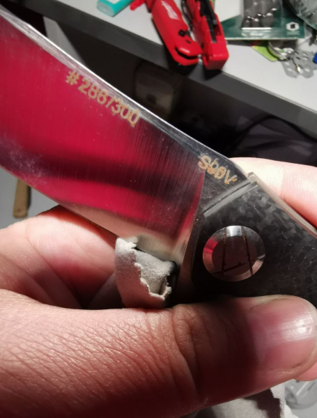 13. Нашел фотки одного из ножей. История простая. Подвал. В один год высоко поднимались грунтовые воды. Подвал не топило, но было влажно. До осушителя дело не дошло, но сквозняк там пытался устраивать. Нож S90V порошок, нержа, хорошая, made in usa. Нож был в чехле и в ящике стола. Обнаружил наверное спустя пол года. Вот такой результат. После аккуратной проработки преобразователем ржавчины.