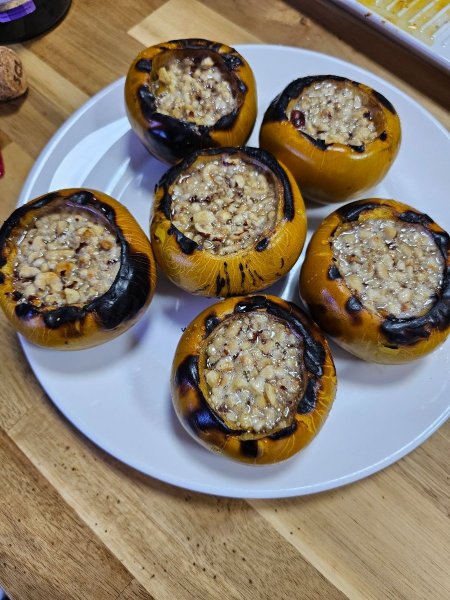 Еще то что повторять не буду. Точнее чуть надо ингридиенты поменять. Хурма, мед, фундук. Плоская хурма котороя очень сладкая как королек, но имеющая очень плотную структуру как яблоко. Ну в общем термообработка эту структуру не поменяло, пришлось ножом резать. Я ожидал что станет мягче. Да и мед кажется лучше заменить тростниковым сахаром типа панелы. Готовил на газовом 285м Вообще 8го сразу на трех грилях работал. Пеллетник с индейкой, уголь с рулетами и картошкой в два уровня. И газ с десертом.