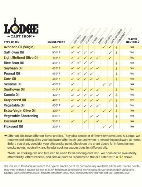 Вот таблица от ложда какие масла подходят для сизонинга чугуна. В наших реалия подсолнечное самое доступное. Точка дымления подсолнечного масла 220-260 в зависимосте высоколеиновое или нет. Земпекаем при температуре 160-200.