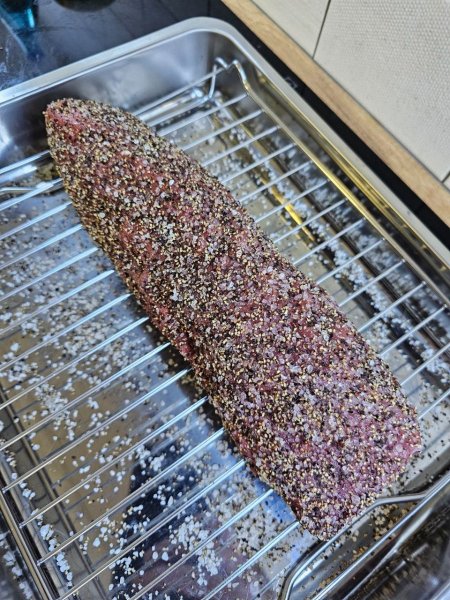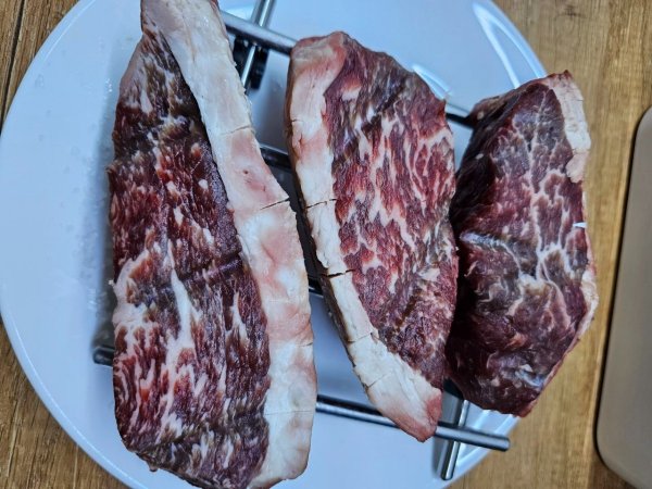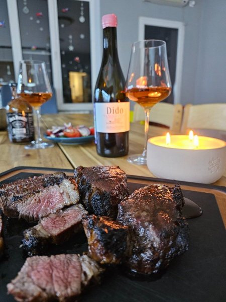 13. Издеваюсь над стейками из трайтипа. Нарезал вчера, посолил крупной солью. Положил на решетку и в холодильник на сутки. Ни капли сока не вытекло, но перед жаркой абсолютно сухая поверхность мяса. Майяр пришел незамедлительно. Запить все вином, разрешить жене палить свечи.
