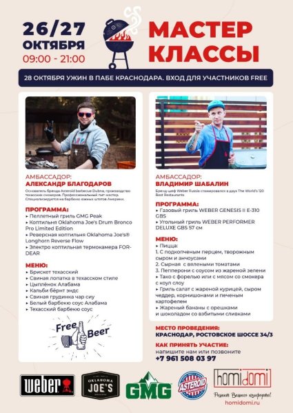 Кто-то говорит 12 часов обучение, это очень долго. Но, когда у Вас 6 грилей + 2 шефа. Поверьте это очень мало. Время пролетает мигом. Теперь обучение будет длиться 2 дня. Первый день учимся. Второй день оттачиваем результат в одном из лучших Пабов Краснодара. КОГДА: 26 и 27 октября ВАМ выбирать. Краснодар, Ростовское шоссе, 34/3. Студия ХомиДоми.ру А 28 октября Спешл Меню в одном из Пабов Краснодара. ТАм все вопросы нашим Шефам. На чем учимся готовить: ▶️ Пеллетный гриль GMG Peak🔥 ▶️ Коптильня Oklahoma Joe's Drum Bronco Pro Limited Edition ▶️ Реверсная коптильня Oklahoma Joe's® Longhorn Reverse Flow ▶️ Электро коптильная термокамера FORDEAR ▶️ Газовый гриль WEBER GENESIS II E-310 GBS ▶️ Угольный гриль WEBER PERFORMER DELUXE GBS 57 СМ Кто обучает: Пит-мастер: АЛЕКСАНДР БЛАГОДАРОВ Шеф-повар: Шеф-повар ВЛАДИМИР ШАБАЛИН Мы учли пожелания наших студентов. Подобрали программу огонь. ЧТО ГОТОВИМ: ✅Брискет техасский ✅Свиная лопатка в техасском стиле (рваная свинина) ✅Цыплёнок Алабама ✅Кальби бёрнт эндс ✅Свиная грудинка чар сиу ✅Белый барбекю соус Алабама ✅Техасский барбекю соус ✅пицца с подкопченным перцем, творожным сыром и анчоусами ✅пицца сырная с вялеными томатами ✅пицца пепперони с соусом из жареной зелени ✅тако с форелью или с мясом со смокера с коул слоу ✅гриль салат с жареной курицей, сыром чеддер, корнишонами и печеным картофелем ✅жареные бананы с орешками и шоколадом со взбитыми сливками СЕРТИФИКАТЫ ВРУЧИМ, Получили их. Кстати Weber обещает свои. (но это не точно)