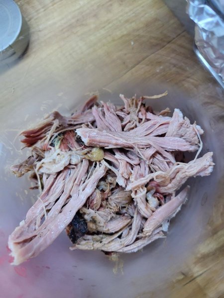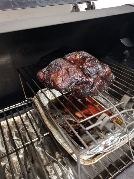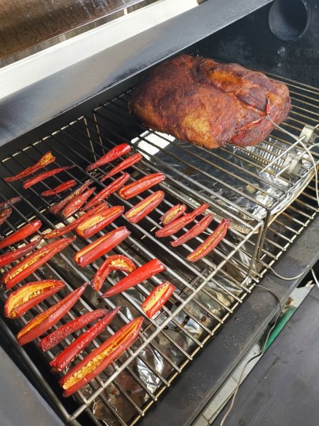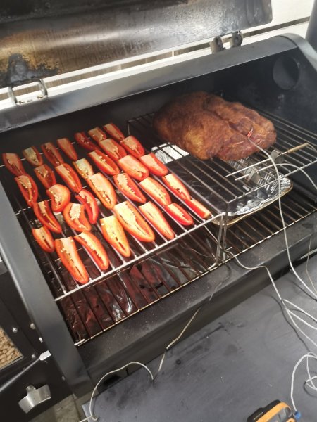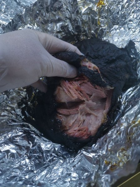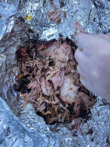 Итак, после файршоу я все же заложил свиную шею. Кусок небольшой около 2кг Не формовал, просто в раб и кинул как есть. Тк тестировал новые пеллеты решил что надо делать naked Решетка второго уровня ближе к трубе. По датчику на верхней решетке температура на 15 градусов меньше чем установленная в гриле. Игрался с датчиками на уровне основной решетки. Перемещение основного отсекателя (который рычагом справа регулируется) дает по сути прямой эффект. Отсекатель влево - на левой решетке +10 градусов от установленной. Отсекатель по центру - в центре +10 Направо под продукт не перемещал. Но думаю эффект понятен. Если вы готовите небольшой продукт на основной решетке то положением отсекателя тупо можно уменьшить эффект поджаривания снизу. Итак 18 часов на температурах 98-120 без заворачивания. Кусок дошел до 87 к 2 часам ночи. Барк очень темный, сродни тому что с угля выходит. Еще час я ждать не стал (довести до 91-93) и завернул в Asteroid одеяло. Разумеется она дошла. На утро спустя 5 часов порвал. Была хорошо так теплой. Вышло прям отлично, копчения без переизбытка. Все идеально в меру. Края не пересохли. На видео будет понятно как разделялась. VID_20230911_111437_760.mp4 VID_20230911_111249_142.mp4