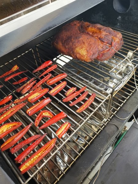 Рваная свинина и чипотле. Можно заметить что перец поменял направление раскладки. Когда начал ужиматься и сворачиваться тупо провалился сквозь решетку 🙂