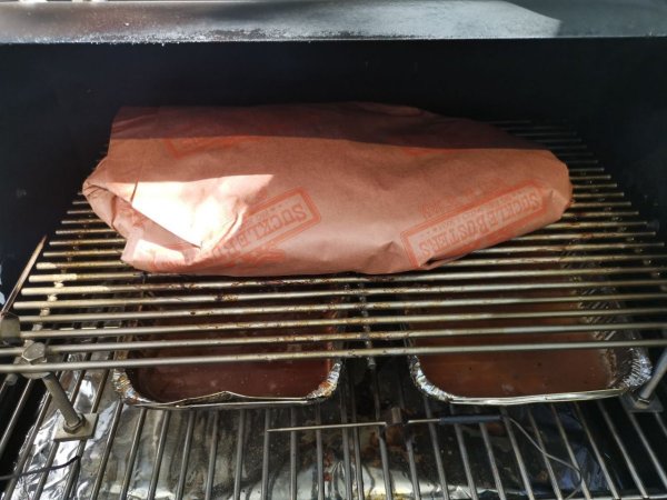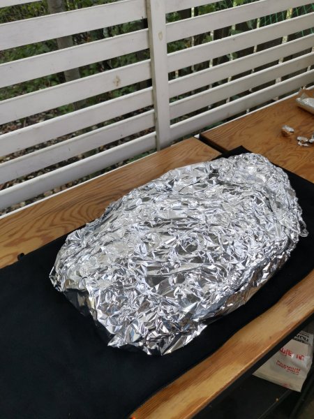 Фольга использовалась когда уже вытащил из гриля. Бумага вся пропиталась жиром, а нужно было в чехол-шубу поместить на отдых.