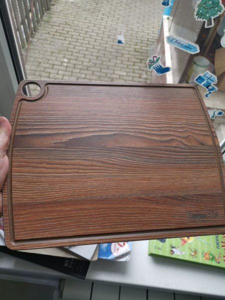 Ничего общего с эпиком. Даже неприятного запаха нет. У эпика есть запах мокрого картона. Реально как кусок ламината, текстура видно наклейка. Внутри пожоже на пластик. Но вполне пойдет как доска для подачи которую можно в посудомойке мыть. 1500 она конечно не стоит.