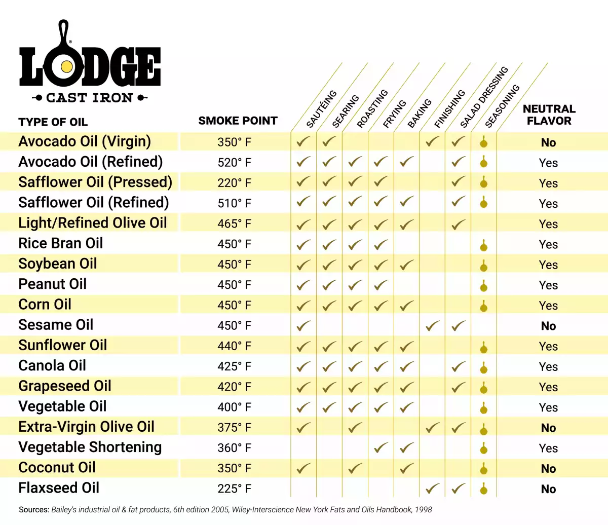 Viper Опубликовано 14 часов назад Поделиться Опубликовано 14 часов назад (изменено) поэтому ... тут эта табличка была, но чтобы не искать.... lodge уже все за вас решил - смотрим на колонку seasoning, smoke point (точка дымления) и neutral flavor (нейтральный вкус) Изменено 14 часов назад пользователем Viper 1 Ссылка на сообщение Поделиться на другие сайты Поделиться